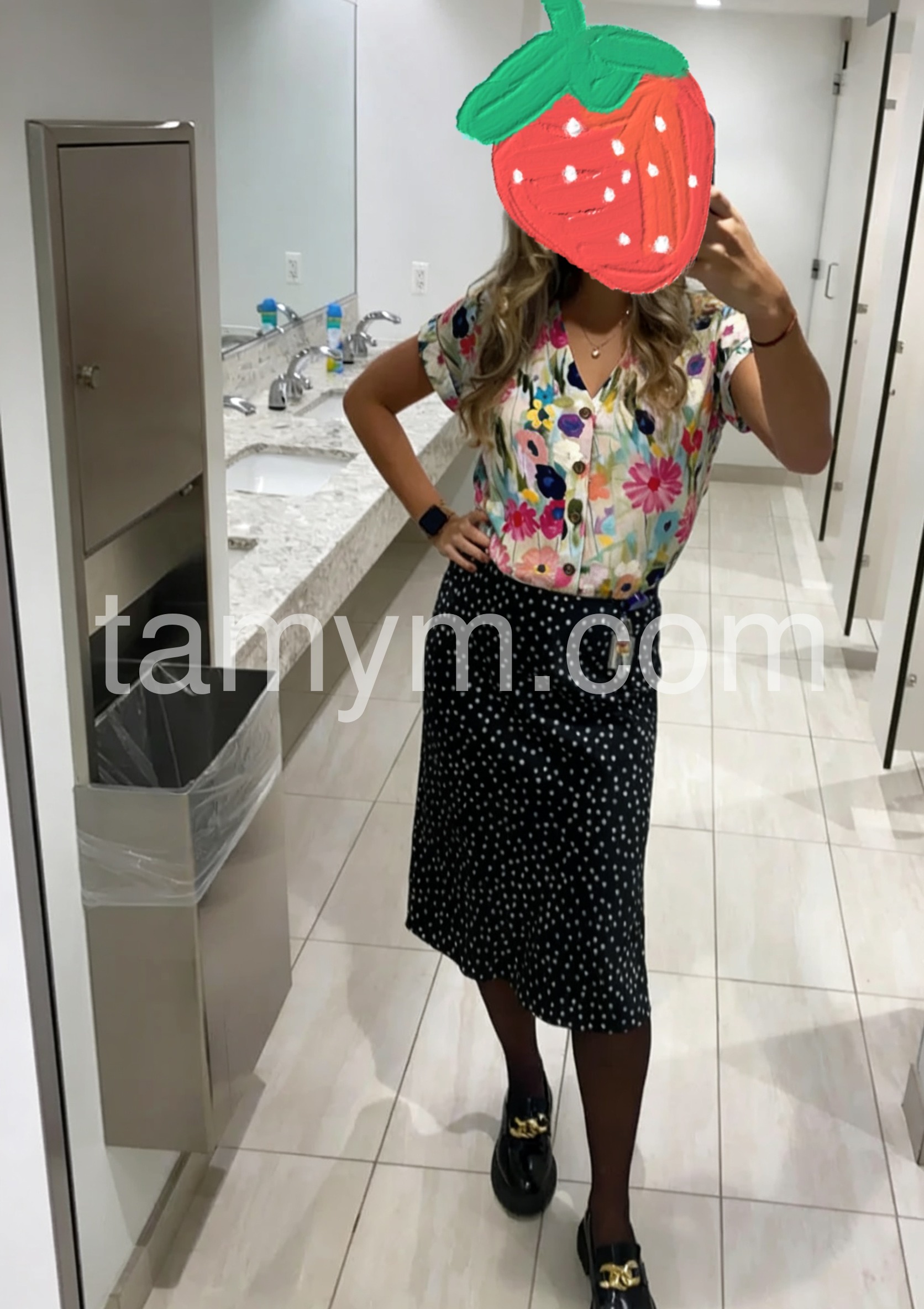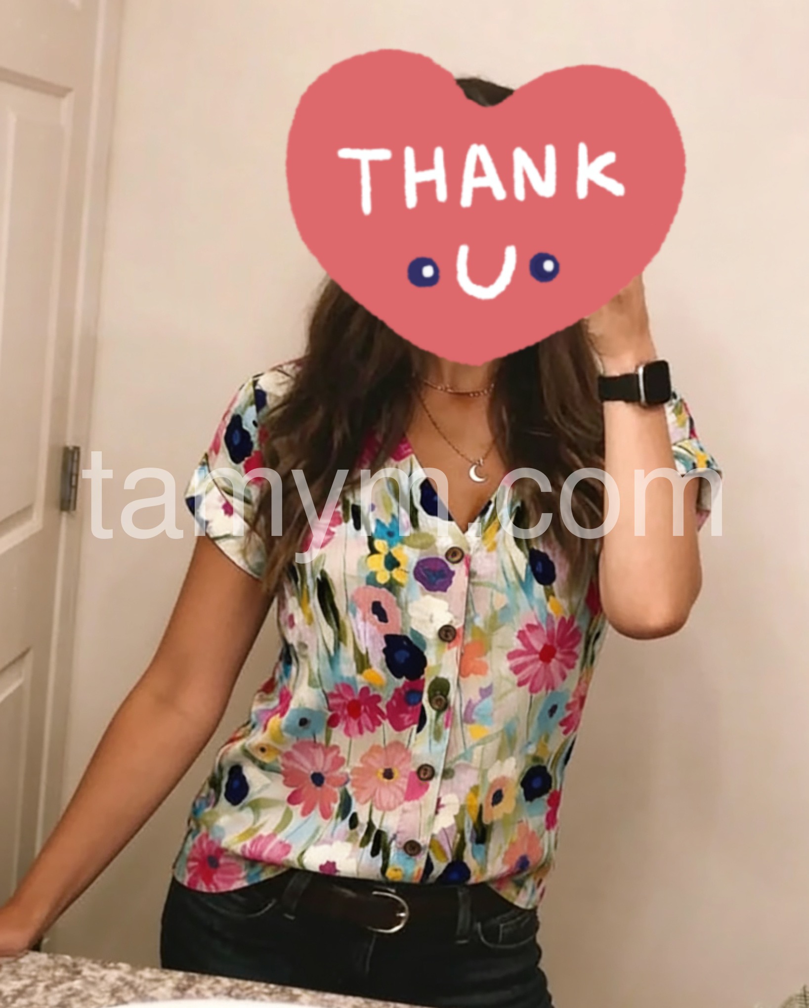 This short-sleeve V-neck blouse features a lively floral print in bold colors. The button-down front adds a classic touch. Lightweight fabric perfect for warm weather. Ideal for casual outings or summer styling. Pair with jeans or skirts for effortless charm.