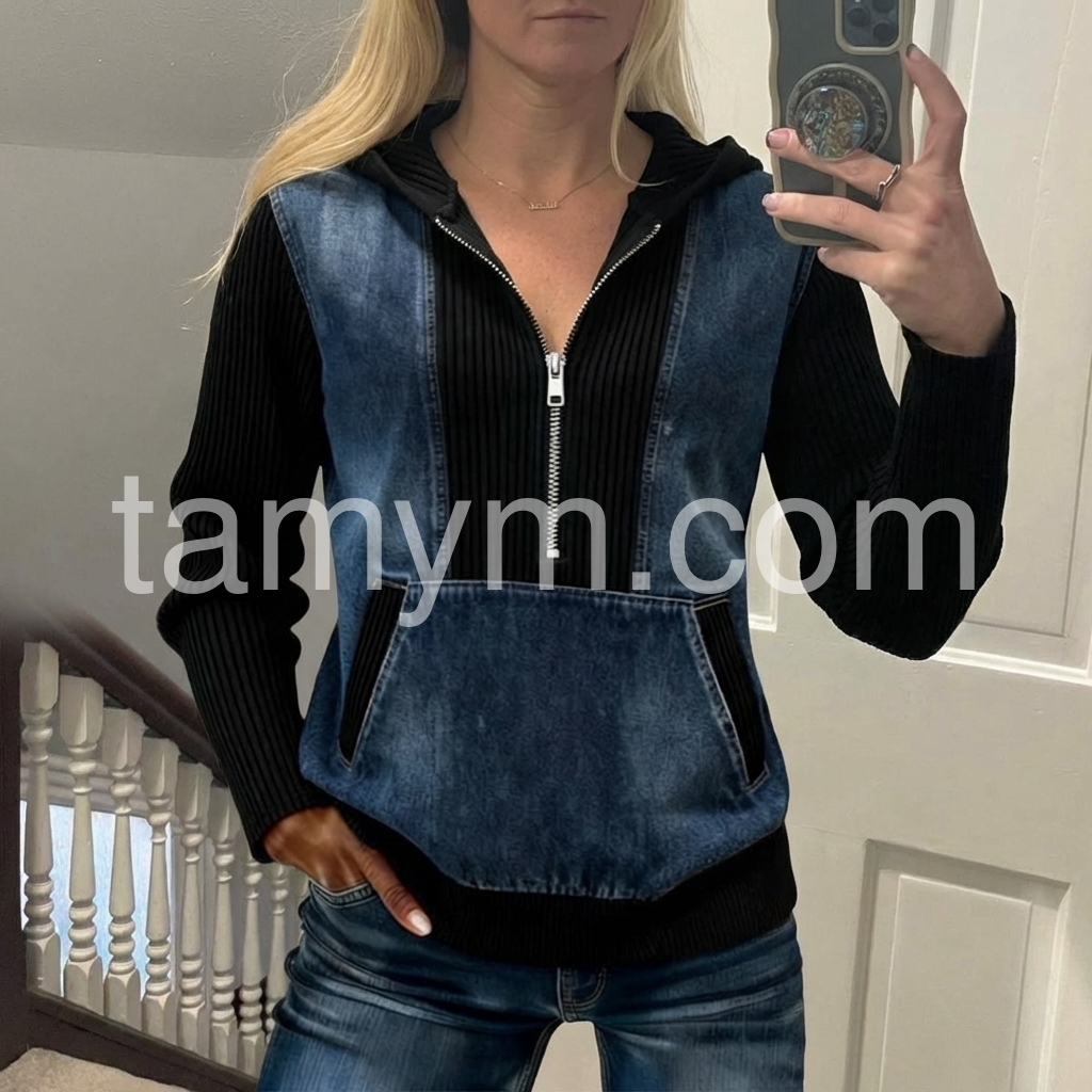 Cool Half Zip Kangaroo Pocket Denim Sweatshirt