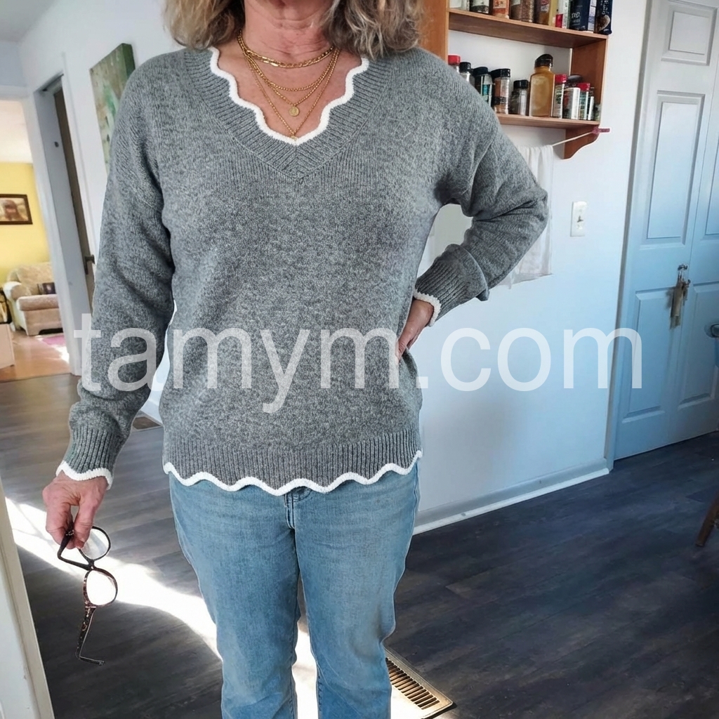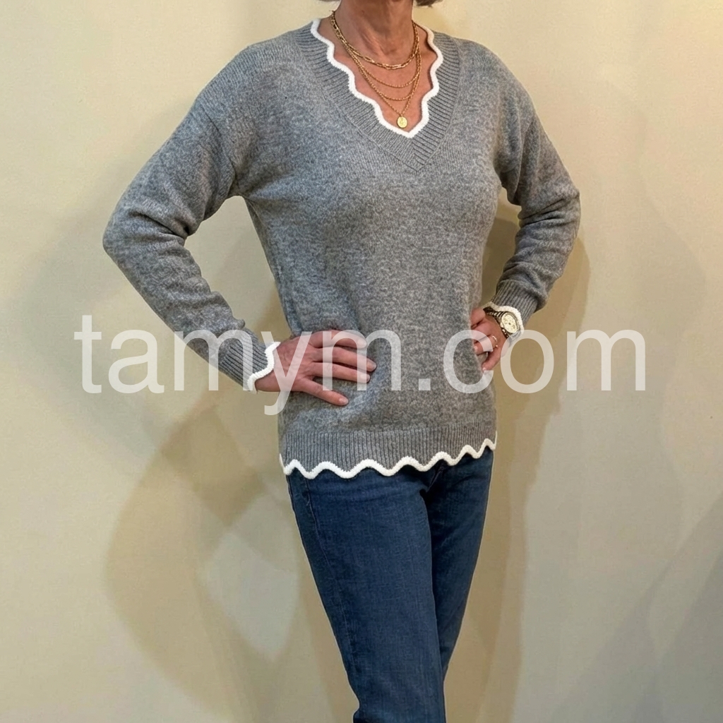 Grey Sweater with White Ruffle Trim