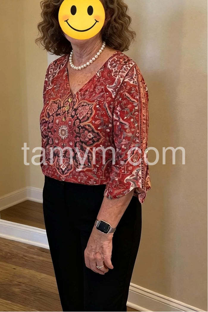 A vibrant bohemian blouse featuring an intricate red paisley print. This elegant top showcases a classic V-neckline adorned with delicate buttons, adding a touch of sophistication. The three-quarter length flared sleeves create a flowy, feminine silhouette, perfect for both casual outings and more dressed-up occasions. Crafted from lightweight, breathable fabric, it ensures comfort all day long.