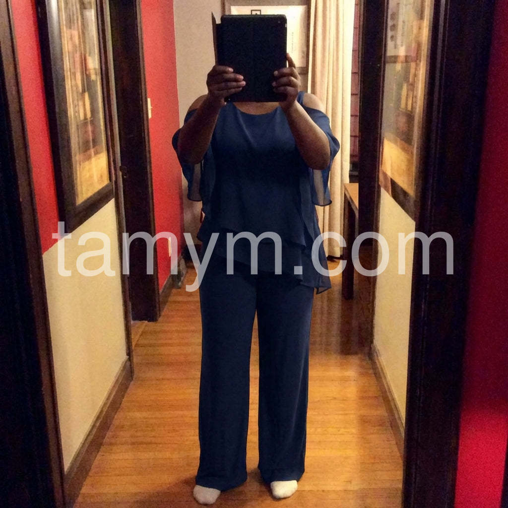 This fashionable two-piece set includes a navy cold shoulder three-quarter length draped sleeves and asymmetrically layered ruffled top and pants. Crafted from lightweight and soft materials, this set is perfect for any occasion. Step up your look with this stylish set.