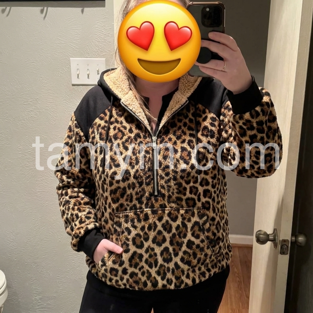 Make a statement with this striking leopard print sweatshirt, designed for those who embrace bold fashion choices. The soft fuzzy lining provides exceptional comfort and warmth, perfect for layering or wearing solo during cooler months. The classic leopard pattern adds timeless appeal to your casual wardrobe, while the relaxed fit ensures all-day wearability. Whether you're running errands or meeting friends, this versatile piece transitions effortlessly from day to night. Durable construction means it'll remain a go-to favorite season after season.