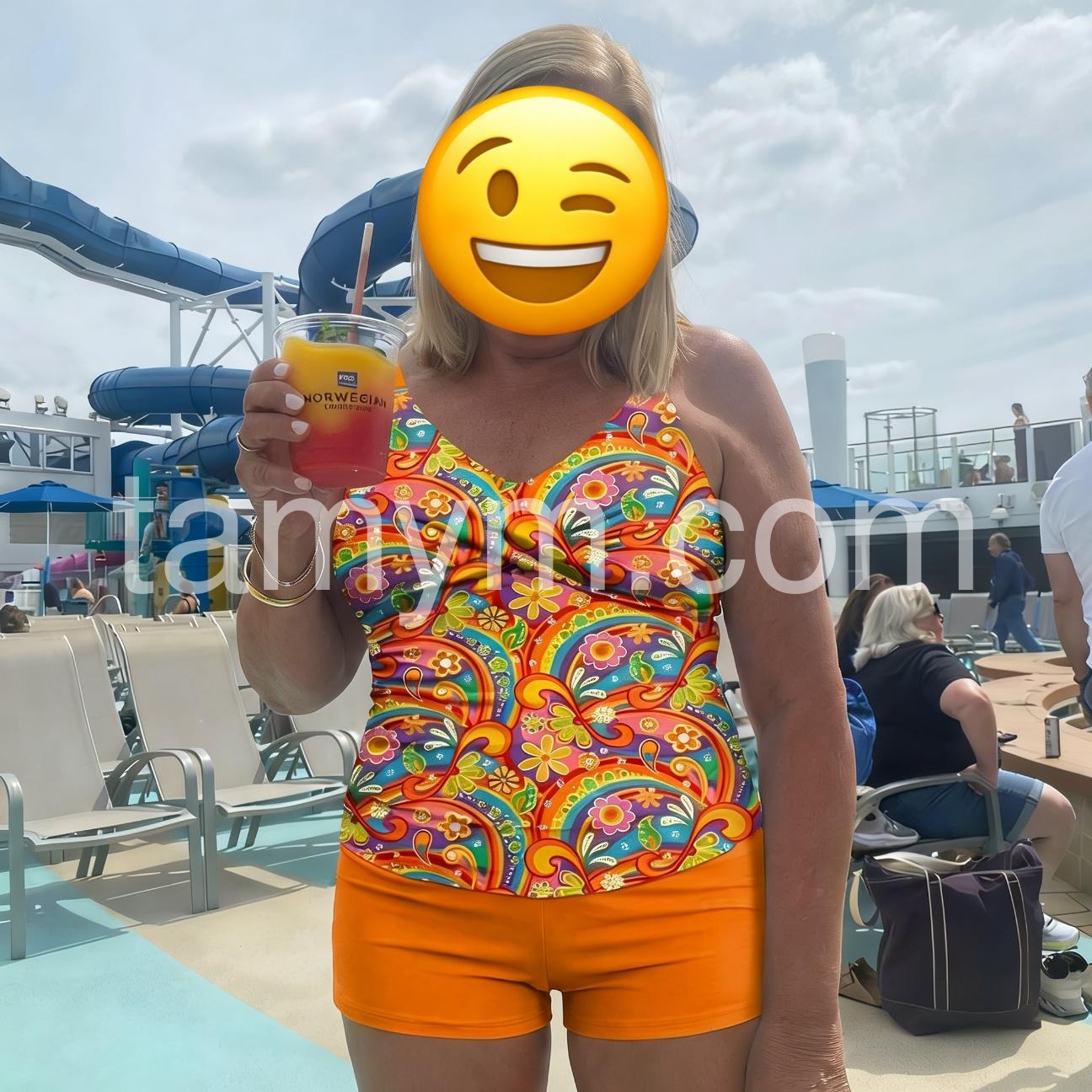 This swimsuit is beautiful and exactly as pictured, the suit design is awesome and really helps hold in and hide a belly, and is very comfortable. And at first I got tons of compliments. Fits true to size.